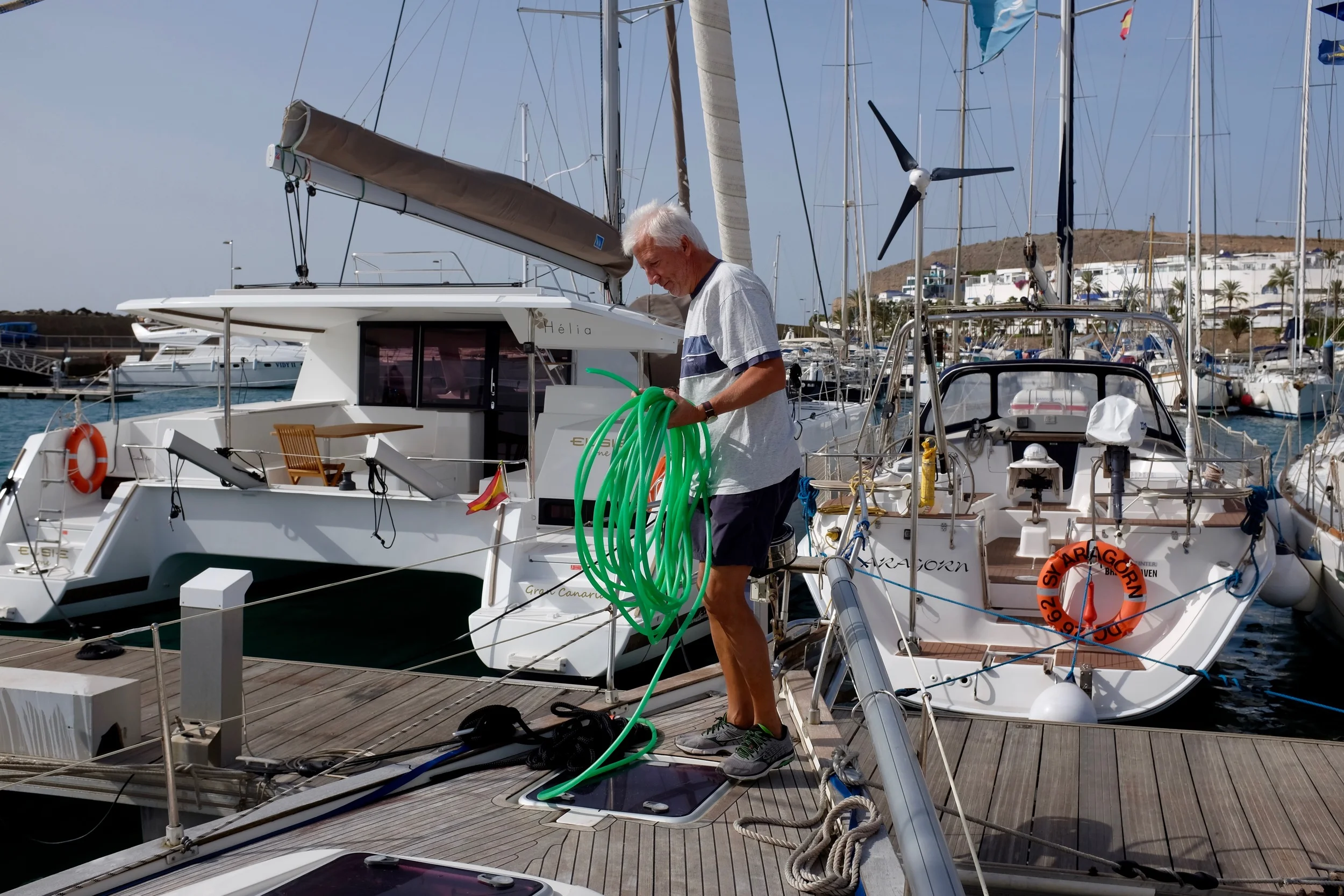 “Seglingen över Atlanten blev i tre etapper. Den första från Lagos i Portugal till Pasito Blanco på Gran Canaria. Den etappen tog 6 dygn. Det var bara Jens och jag som seglade denna sträcka. Jag minns den som ganska lugn med blandad segling och motorgång. Vi kunde bland annat segla med gennakern.